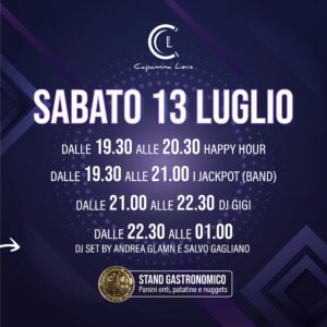 Dall’11 al 12 luglio 2025 i dj ospiti si alterneranno nel movimentare le serate con le loro scalette musicali al ritmo della musica travolgente per ballare fino allo sfinimento.